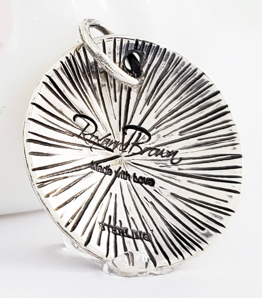 Measurements: Pendant 7/8" wide x 1" long with the bail. 20" sterling silver necklace chain.
