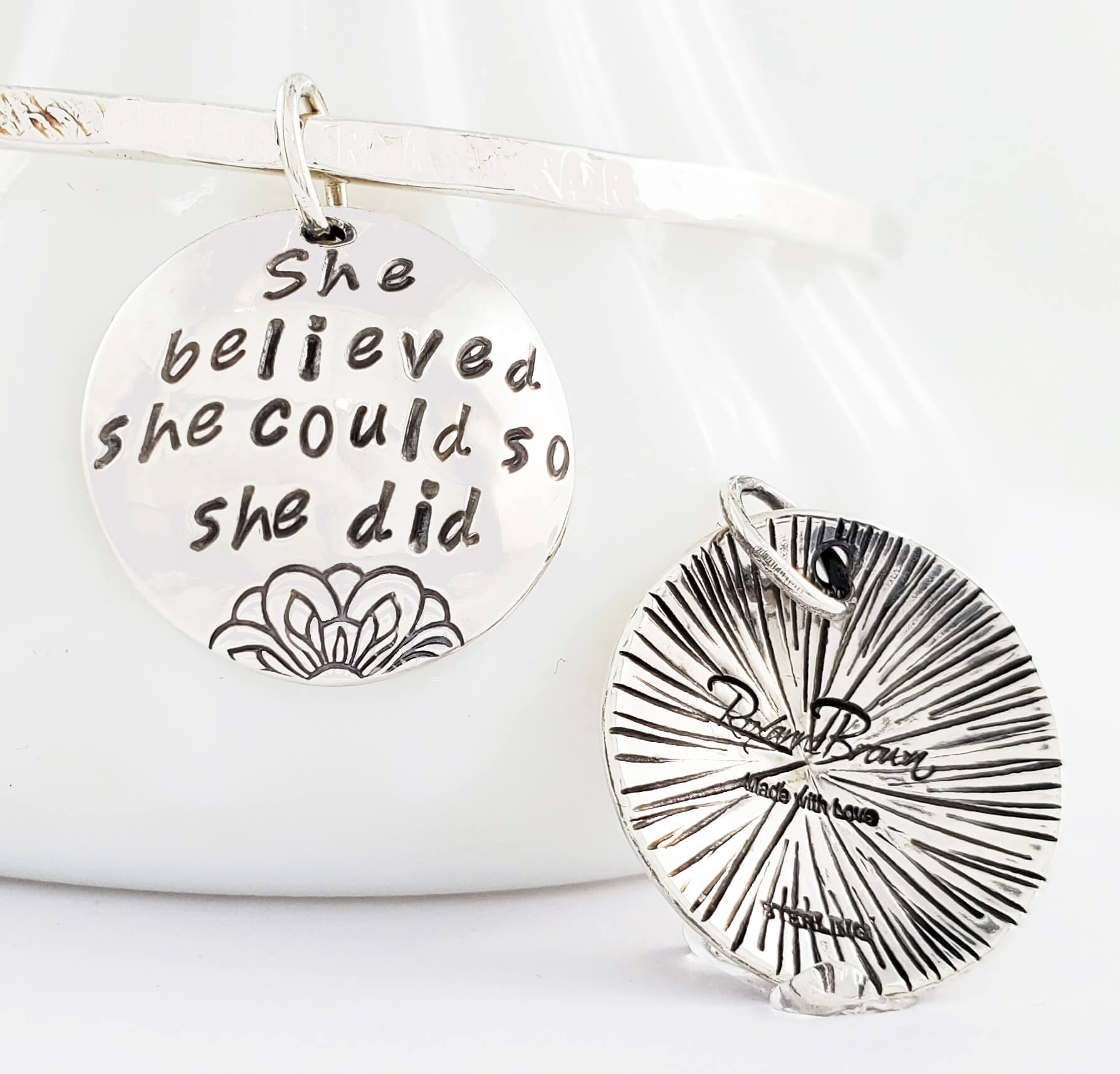 You can choose to order just the pendant alone or add a 20" sterling silver necklace chain to your order. They will also make an excellent charm attached to your bangle or any bangle here in the Bracelet Category.